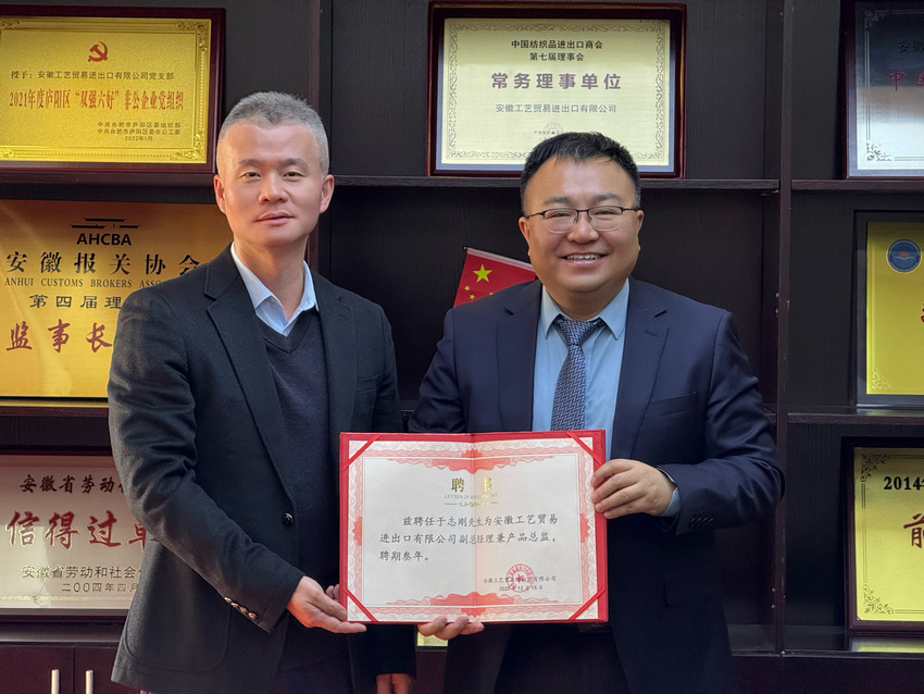 今日,安徽工藝貿(mào)易進(jìn)出口有限公司正式宣布,資深外貿(mào)專家于志剛先生加盟公司,出任公司副總經(jīng)理兼產(chǎn)品總監(jiān),全面負(fù)責(zé)公司產(chǎn)品開發(fā)及新業(yè)務(wù)員培養(yǎng)工作。這是安徽工藝在業(yè)務(wù)拓展及戰(zhàn)略方向上邁出的一大步,也是安徽工藝積極探索高質(zhì)量發(fā)展的關(guān)鍵一步。