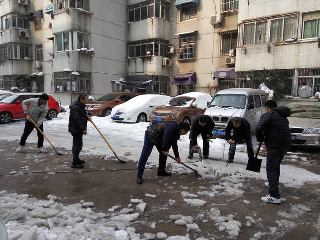 ?風(fēng)雪過(guò)后的第一個(gè)工作日,公司黨員、團(tuán)員、工會(huì)委員以及普通員工,自發(fā)組織起來(lái),進(jìn)行了一場(chǎng)“破冰行動(dòng)”。大家紛紛拿起鐵鍬、工具,對(duì)公司周?chē)访娴姆e雪、冰層進(jìn)行鏟除、清理。雖然室外的氣溫很低,一個(gè)個(gè)把手和臉凍得通紅,但大家依舊干勁十足??此茙筒簧鲜裁疵Φ呐荆o大家送來(lái)了防護(hù)手套,一個(gè)個(gè)看似平凡又暖心的舉動(dòng)將這片土地照得火熱。