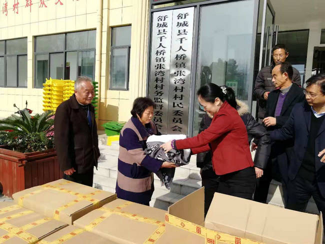 ??? 寒風(fēng)習(xí)習(xí),陽光明媚。11月22日,時(shí)值小雪之日,公司董事長薛穎與中國出口信用保險(xiǎn)公司安徽分公司總經(jīng)理鄧成釗率隊(duì)一同前往信保安徽分公司定點(diǎn)扶貧村----舒城縣千人橋鎮(zhèn)張灣村考察學(xué)習(xí)。他們?cè)趶垶炒鍏⒂^了村支委會(huì),看望慰問了駐村扶貧工作隊(duì)、當(dāng)?shù)貙W(xué)校師生和貧困戶代表。趙克勇代表公司認(rèn)真挑選,整理了16箱、500條御寒毛毯,分別送給了村養(yǎng)老院和貧困戶,在這小雪之日送去公司的溫暖。